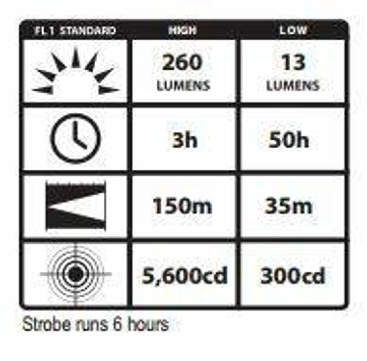 - High Output: Bright light: 350 lumens; 6,300 candela; 159m beam; runs 3.25 hours