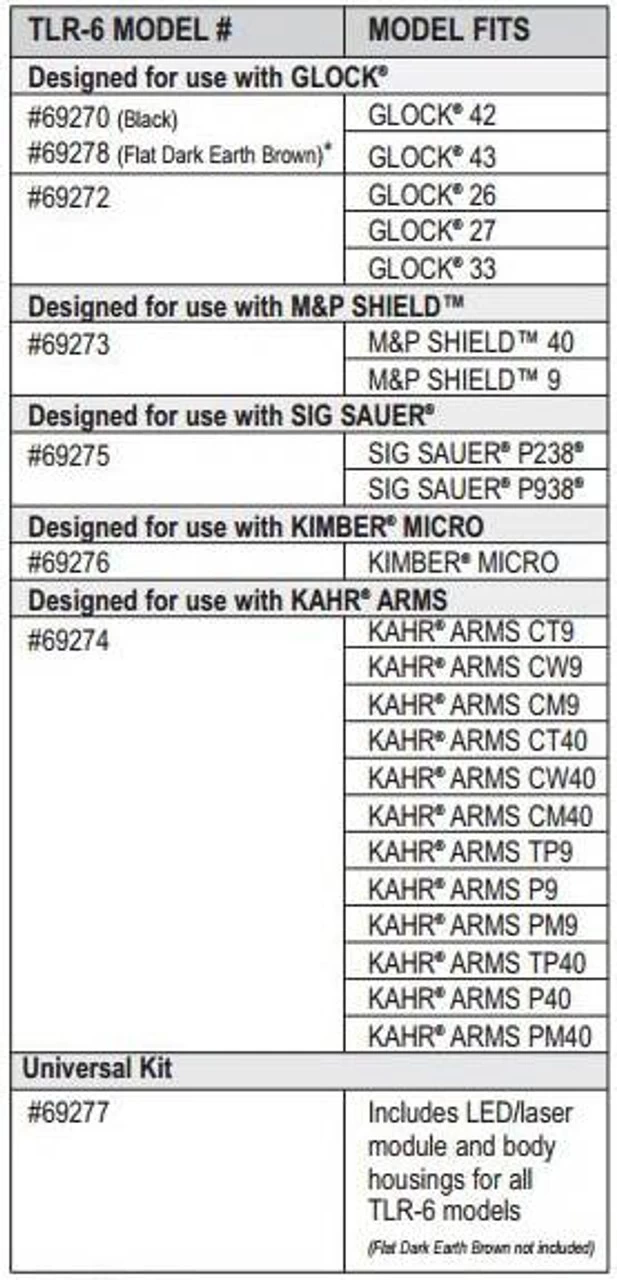 - The TLR-6 Universal Kit includes one Light/Laser module and 6 housings for use with 18+ subcompact handgun models