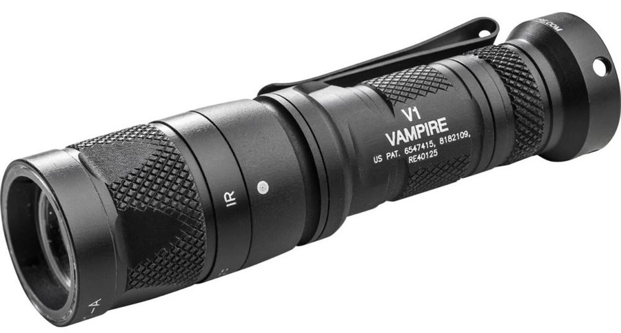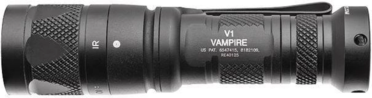 The V1 Vampire Flashlight is an ultra-compact, combat-ready dual-output flashlight that provides both white light and infrared output without the need for an IR filter. This ground- breaking handheld illumination tool features virtually failure-proof power-regulated white and infrared LEDs and a precision Total Internal Reflection (TIR) lens that optimally shapes both beams for reach and surround light. The V1’s click-type tailcap switch shrouded to help prevent accidental activation lets you quickly select an output level. In white light mode, partially press the tailcap pushbutton for a momentary-on 250-lumen high-output beam; press further to click constant-on high. Return to off and press or click again within two seconds for 5-lumen low-output beam with extended runtime. To switch between white light, disable, and infrared modes you simply pull then twist the front knurled portion of the bezel. The tailcap switch again lets you easily select output levels in IR mode partially press for a momentary-on 100-milliwatt high-output beam, press further to click constant-on high. Return to off and press or click again within two seconds for a 5-milliwatt low IR beam. The V1 Vampire runs on a single 123A lithium battery, is constructed of aerospace aluminum that’s Mil-Spec hard anodized for extreme durability, and is 0-ring and gasket sealed to keep out moisture. The V1 also features a lockout tailcap, which prevents accidental activation during storage or transport.