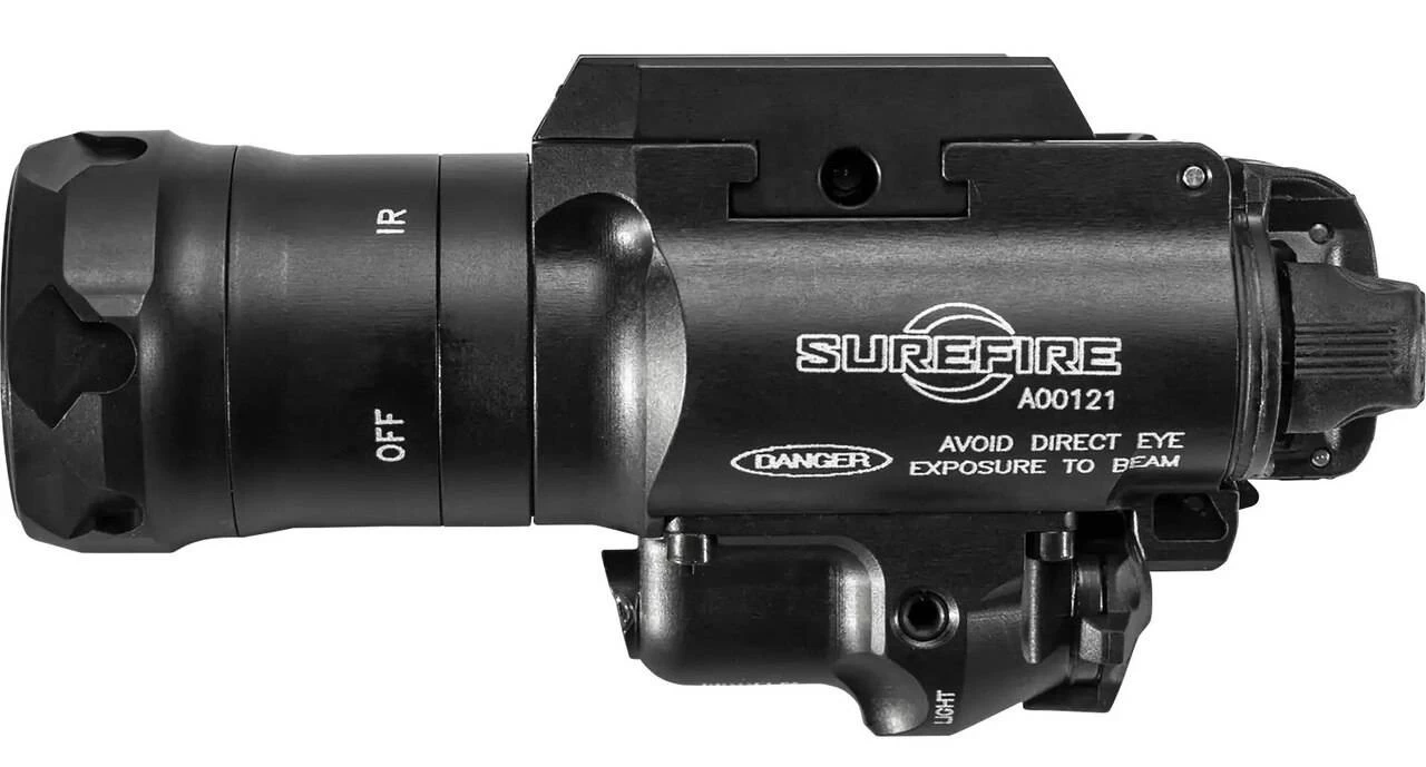 The Surefire X400VH-B-IRC Infrared / White Handgun Holster Light integrates perfectly with the MasterFire Rapid Deploy Holster for quick and easy deployment as well instant-on light activation, making this the perfect companion for low-light, high-stress situations. The X400VH features a V-Series head, providing both white-light and infrared illumination, plus an integral Class 1 infrared laser aiming device. The options on this light consist of 350 lumens of visible, tactical-level light or 120 mW of IR illumination with just a twist the bezelโs self-locking selector for use with NVGs. The infrared laser provides a highly visible dot for aiming during stealth operations where focusing on iron sights with NVGs can be challenging.